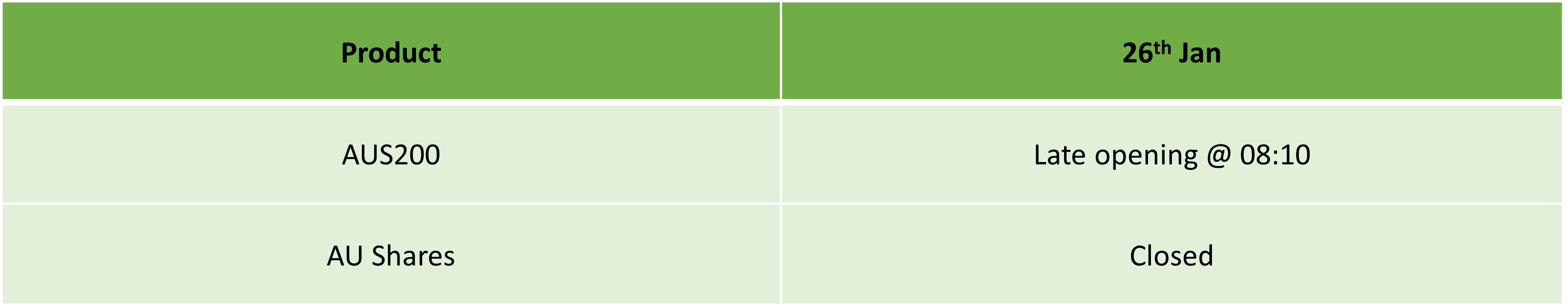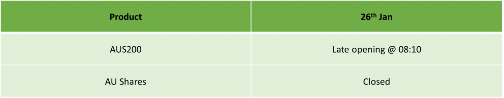 Vui lòng tham khảo lịch giao dịch cập nhật và các thông tin chung liên quan đến Ngày Quốc Khánh Úc (Australia Day) vào Thứ Hai, ngày 26 tháng 01 năm 2026.